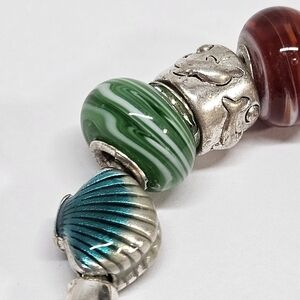 Vintage ocean theme mixed lampwork European style bead charm bracelet. Includes a mix of charms made of glass and silver-tone metal. Lobster clasp close with a small fish detail. Bracelet measures about 8" long. No makers marks on beads and bracelet. Excellent condition and smoke-free home.