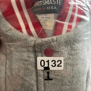 Vintage Ohio Varsity Bomber style jacket with grey fleece body and red satin sleeves. Snap front closure.