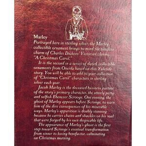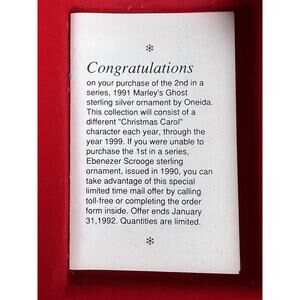 A striking sterling silver ornament from 1991 by Oneida, featuring “Marley’s Ghost” from the classic A Christmas Carol. This collectible piece stands approximately 3.5 inches tall (per listing specs), includes original box(in excellent condition) and hanging cord, and is marked “Oneida LTD Sterling” (as other examples show). It captures the Victorian-ghostly charm of the Dickens tale and adds a vintage, premium look to holiday décor. This is the 2nd in the Oneida "A Christmas Carol" sterling silver ornament series. Please review clear photos for condition, patina/tarnish, and originality of box/cord. Most items ship next day.