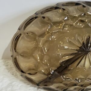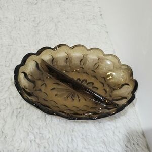 1970's Vintage Anchor Hocking Oval Glass Amber Divided Relish Tray. Fairfield pattern, approximately measures 5" x 7". No chips or wear. Durable. Excellent quality and condition.