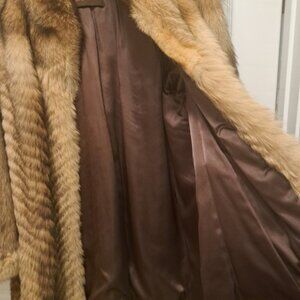 Beautiful long-sleeved heavy-weight authentic coyote fur coat in excellent shape purchased from Paddor's in Chicago. One owner. Brown acetate lining. The upper and lower sets of metal hooks/eye closures to wear the coat closed. Embroidered initials inside: "MAT" This is a must-have for cold climates or special occasions. Materials label: FUR ORIGINAL CHINA, 100% ACETATE LINING, FURRIER DRY CLEAN METHOD RECOMMENDED. MADE IN HONG KONG.