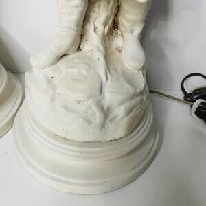 Add a touch of vintage charm to your home with this beautiful pair of chalkware table lamps. Featuring a classic man and woman figure design, these lamps are sure to be a conversation starter. They would be great on your nightstands, living room or office.