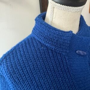 Toggle closure, from the 60's or so I believe. Small holes as seen in photo, more so from stretching of fabric. Additional small spots of discoloration also seen. This is a classic sweater with heavy wool. Fair condition but lots of life left.