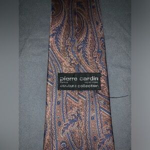 Rare/Vintage Pierre Cardin Neck Tie. From the Couture Collection by Pierre Cardin. Like New. Peachy Color w/ Blue Designs. Made in Italy. 100% Silk.