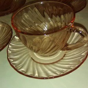 VINTAGE PINK DEPRESSION GLASS CUPS AND SAUCERS SET
