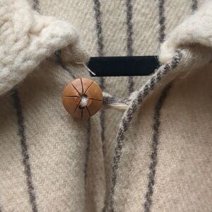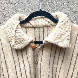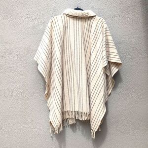 VINTAGE WOOL CREAM GRAY STRIPED HORSE BLANKET FRINGED Knit collar. PONCHO ONE SIZE Open SIDES. Warm and cozy for outside chores, football games. Excellent overall condition It has been machined washed in cold water, air dryed.