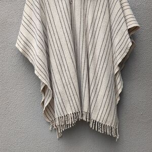 VINTAGE PONCHO WOOL CREAM GRAY STRIPED HORSE BLANKET FRINGED RelaxWarm ONE SIZE