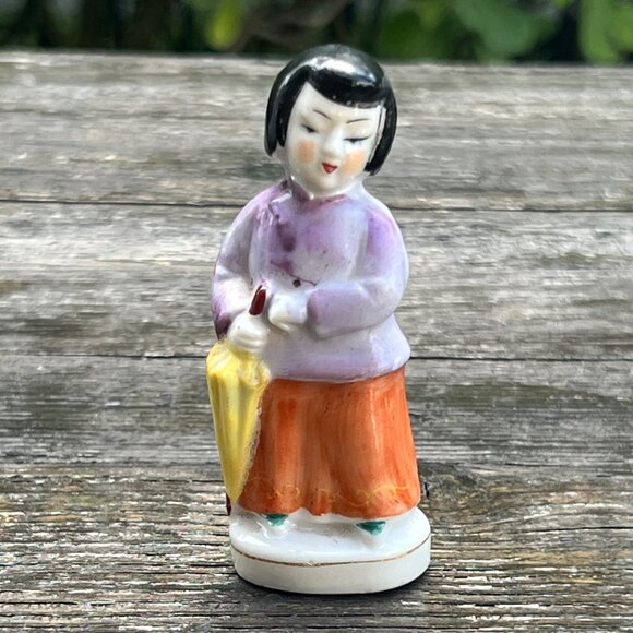 VINTAGE PORCELAIN JAPANESE FIGURINE Woman Umbrella 3.5” Asian Japan Makers Mark