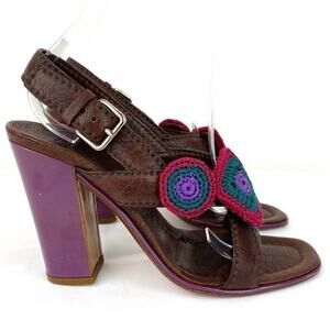 PRADA CROCHET DETAIL BROWN LEATHER CHUNKY HEEL SANDAL SZ 5.5 or 35.5 In very nice preloved condition. Flaws, moderate wear on patent leather heels, scuffs and scratches, see photos. Moderate wear on outsoles. Please check the photos carefully prior to purchasing.