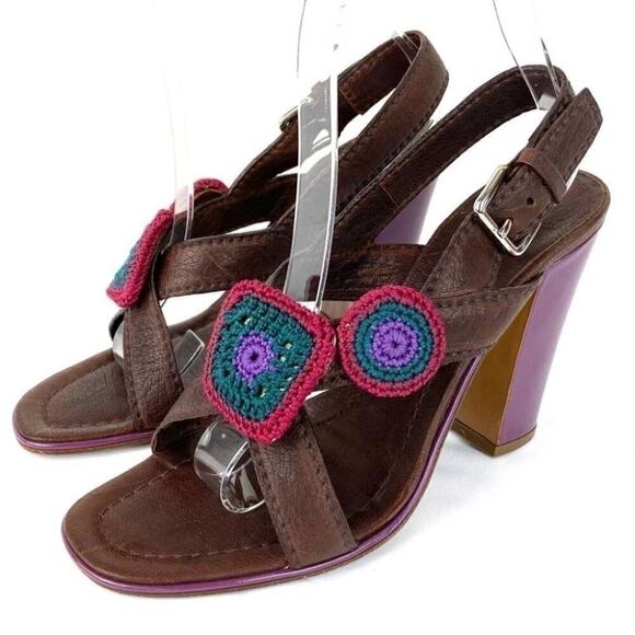 VINTAGE PRADA CROCHET DETAIL BROWN LEATHER CHUNKY HEEL SANDAL SZ 5.5 or 35.5