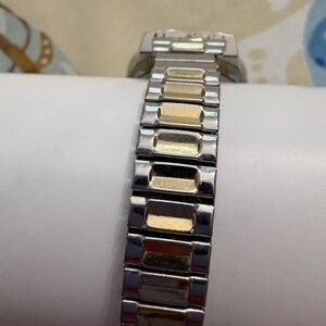 NOTE: that on two links of the two tone band the gold small top metal pieces are missing - cosmetic issue. SEE THE LAST PHOTO. The band still works properly and when worn this doesn't really deter from the functionality of the band or the watch.