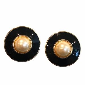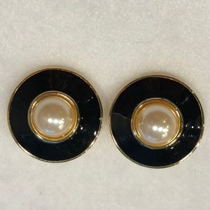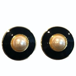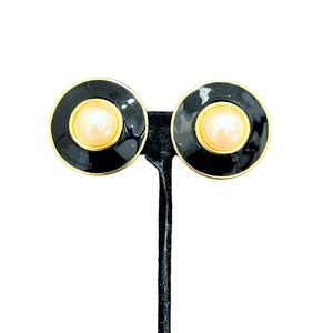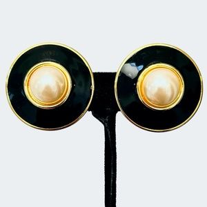 Vintage Premier USA black enamel and faux pearl clip on disc earrings in very good preowned condition. The earrings are gold tone. 1.25”D