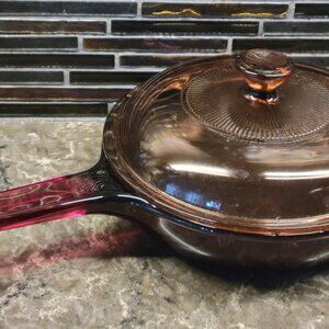 VINTAGE PYREX CORNING WARE 1980s CRANBERRY PURPLE GLASS VISION VISIONS TEFLON 7” SKILLET, good clean used condition from a smoke-free home. No chips or cracks in the glass; however, there are a couple utensil marks on the Teflon coating (please see pictures). This would make an excellent addition to your Vintage Pyrex Vision Ware cookware collection.