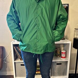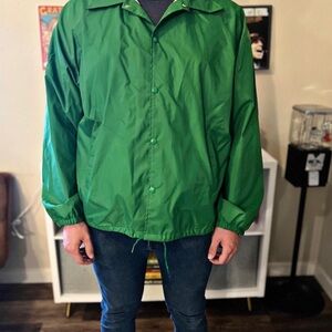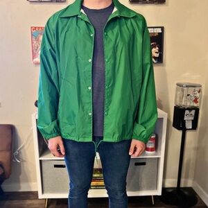 Vintage - Late 60s, early 70s waterproof lined windbreaker snap jacket. Sized at XXL. Fits mens XL. Cuffed sleeves.