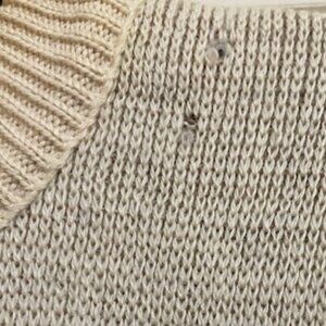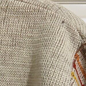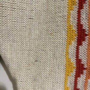 This is a rare vintage 1970's sweater and has some yellowing from age, especially on the trim, and several small tears or holes. I am the original owner and it hasn't been worn in years, just stored in a closet. It has been recently dry cleaned. Please review pictures carefully before purchasing. Smoke-free, pet-free home.