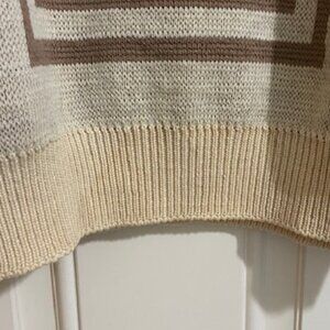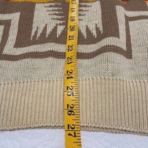 VINTAGE Pendleton Virgin Wool Harding Sweater Chief Joseph Pattern Size L. Sweater is beige with brown, orange, and yellow hues.