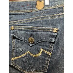 VINTAGE Pepe Jeans London Women's Size 34 but measures closer to a 36, dark Blue Denim, Y2K 34x29, Embroidered pockets, Fleur-De-Lis embellishments.