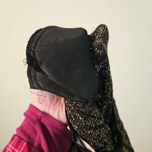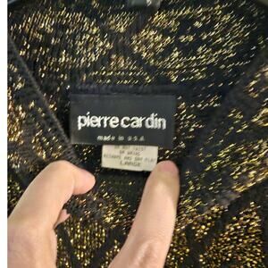 Step back in time with this stunning Pierre Cardin Black & Gold Mock Neck Sweater, a true gem from the 70s or 80s. Crafted from a luxurious cotton and metallic blend, this size large sweater is in excellent condition, free from any flaws or wear.