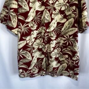 Embrace island vibes with this Tommy Bahama Hawaiian shirt. Featuring a striking red and cream leaf pattern, it's perfect for casual outings or beach days. Enjoy comfort and style with this standout piece.