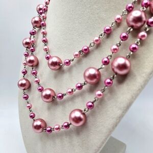 Vintage pink glass bead three strand necklace. Silver-tone hardware. Adjustable lobster clasp back close. Measures 15.5 to 19". Purchased from an estate and no visible maker's mark. Excellent condition and smoke-free home.
