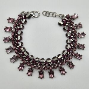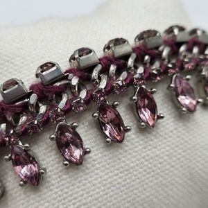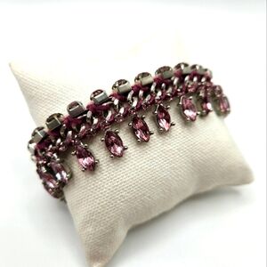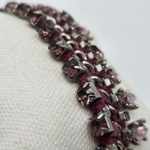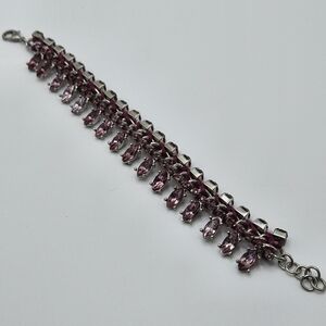Vintage rhinestone beaded bracelet. Rhinestones are made of glass and a mix of pale pink and lavender colors. Silver-tone hardware. Adjustable lobster clasp close. Measures about 7.5-8.5". Purchased from an estate and no visible maker's mark. Excellent condition and smoke-free home.