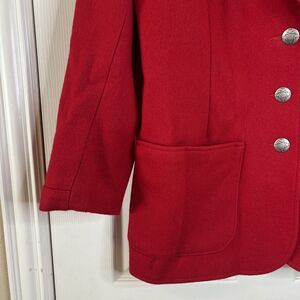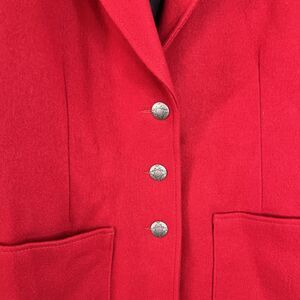 The product is a vintage Pioneer Wear women's Western red wool jacket in size large, made in the USA. This jacket features a classic Western style with a bold red color and is designed specifically for women. The brand, Pioneer Wear, is known for its quality and Americana aesthetic, making this jacket a unique and stylish addition to any vintage clothing collection.