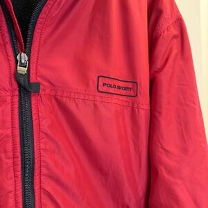 Keywords: Polo Sport, men's jacket, windbreaker, red jacket, XL jacket, fleece lined, vintage jacket, casual wear, nylon jacket, full zip closure, embroidered logo, machine washable, pre-owned jacket.
