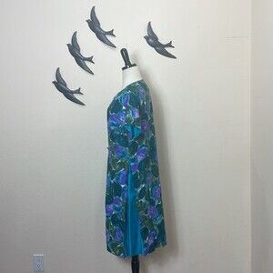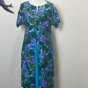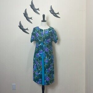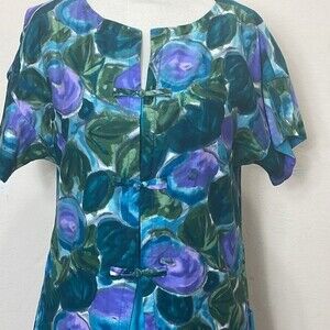 I am guessing on the age - Possibly 1950's/ 1960's / 1970's. No size tag or fabric content.  Appears to be silk, possibly handmade.  Beautiful Teal & purple watercolor print, Short sleeves; Button front over a solid teal bodice; patch pockets on the side panels.