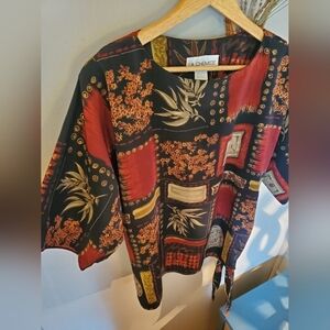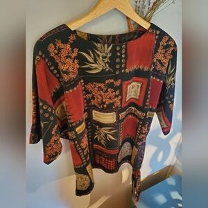 Beautiful Vintage shirt with bold print, olive leaf, cherry blossoms, black, greige, sage and rust pattern, unique, Asian style, block pattern, 80s, 90s Y2k, made in USA