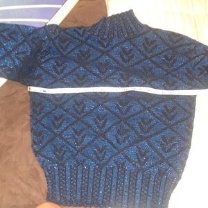 Vintage Private eyes black & blue metallic, mock turtle neck sweater Size Medium (please see pics for measurements). I am not sure if the color comes thru in the pics but the black is flat black and the blue has a metallic sheen. So cool!! vintage. 80s awesome