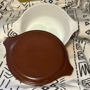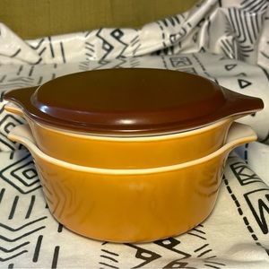 3-Piece Pyrex set. Vintage Pyrex Old Orchard Covered Dishes Butterscotch Brown 1, 1 1/2 Pt Casserole. Cover fits both dishes.