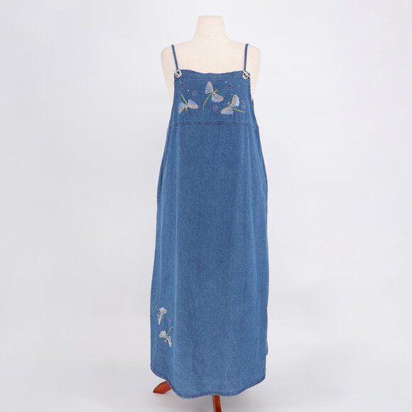 VINTAGE QUACKER FACTORY Dragonfly Embroidered Denim Maxi Overall Dress Size 16