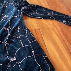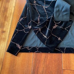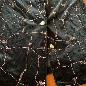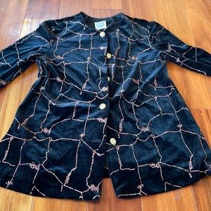 Vintage 1990’s R & M Richards by Karen Kwong jacket. Size 8P. 90% polyester 10% spandex. Made in USA. Black velvet line material with bright pink and yellow stitching. Five gold with rhinestone center buttons. Slits on sides. One button is missing a rhinestone. Armpit to armpit measures 18.5 inches. Top of sleeve to bottom measures 21 inches. Top to bottom measures 27.75 inches. Good condition.