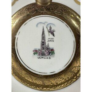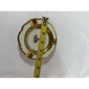 This vintage ashtray is a true gem for collectors. The round shape measures 3 3/4 inches in diameter and features a beautiful gold trim that adds a touch of elegance to the piece. It's perfect for anyone who appreciates unique and vintage items, as well as those who enjoy collecting tobacciana.