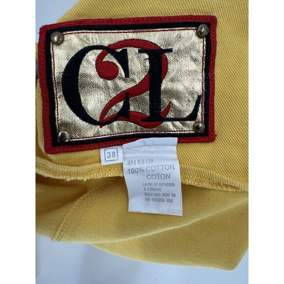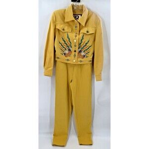 This vintage designer Christian LLinares two-piece set includes a matching jacket and jeans, both adorned with embroidered geometric patterns. The yellow denim set features a button closure, collared neckline, and long sleeves, making it perfect for various occasions such as travel, parties, or casual wear. The classic fit outfit is comfortable and easy to care for, with machine washable 100% cotton fabric. The retro 80's style set is a rare find that adds a unique touch to any wardrobe for the winter, fall, or spring seasons.