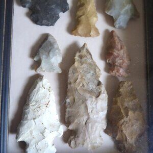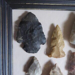 This is a vintage collection of 8 (eight), real, American Indian arrowhead artifacts. They have been framed in a wood shadowbox frame. All of these arrowheads were found in Oklahoma in various fields that had been plowed. These were my late father-in-law’s collection of arrowheads he found while living in Oklahoma. The back has an easel stand to allow to display it on a table or it can be hung on a wall. (See photos for details) I am the original owner. It has been in climate controlled storage. Comes from a pet and smoke free home.