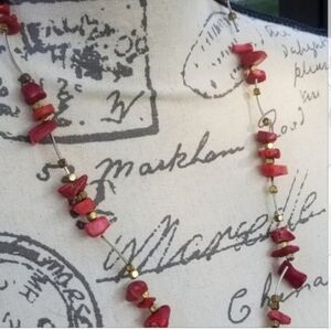 Vintage necklace made with exotic red coral and goldtoned and silvertoned spacer beads. Necklace measures 26 inches in length with a spring clasp closure.