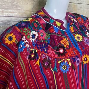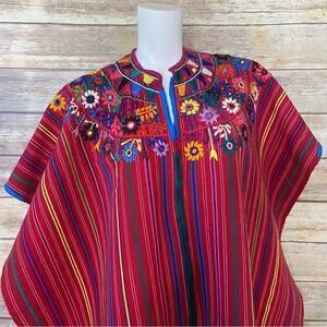 VINTAGE RED GUATEMALAN HAND LOOMED KAFTAN FLORAL EMBROIDERED HUIPIL DRESS. This vintage red Guatemalan kaftan is a beautifully hand-loomed huipil dress, featuring vibrant floral embroidery on the upper bodice. The striking combination of red cotton with multicolored stripes and intricate floral patterns reflects the rich cultural heritage and skilled craftsmanship of Guatemalan artisans. It is one size fits most. I have collected and sold many of these. This is the best one I have seen and in excellent condition.