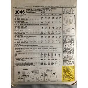 This is a Mccall's, pattern #3046. It is dated 1971. It is size 14, Bust 36, Misses. It is coordinated separates. It has been cut. The outside envelope has some wear, but the all the pieces are there and in good condition. The instructions are included.