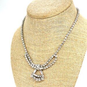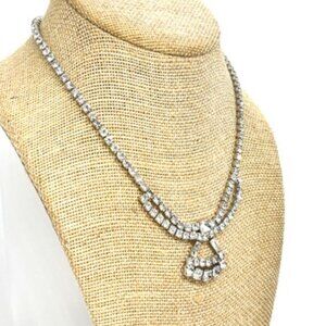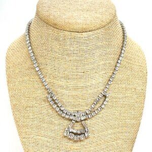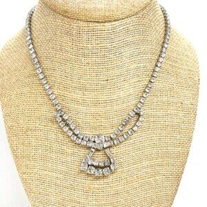 VINTAGE RHINESTONE NECKLACE ART DECO FAN DROP SILVERTONE 16” GLAM BRIDAL