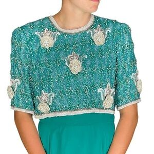 DETAIL: HAS THE LOOK OF A TWO PIECE SET, BUT IT IS ALL ATTACHED. CHIFFON SKIRT. TOP OVERLAY FULLY BEADED AND ATTACHED TO UNDER BODICE. HOOK AND EYES DOWN BACK. METAL ZIPPER UNDERNEATH. SHOULDER PADS. HEAVY BEADING WITH ATTACHED LACE FLOWERS. HALF SLEEVES. FULLY LINED.