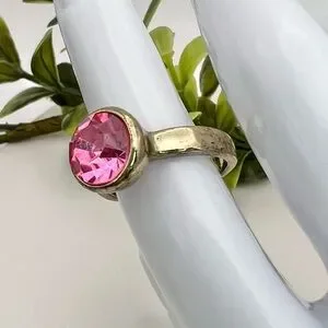 Elegant gold tone ring featuring a stunning pink crystal. Perfect for adding a touch of color to any outfit.