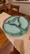 WONDERFUL LAZY SUSAN FROM RIO GRANDE WARE, DALLAS, TEXAS. THIS SET COMES COMPLETE WITH THE POTTERY SERVING PIECES (4) AND THE WOODEN LAZY SUSAN.THE POTTERY PIECES ARE TURQUOISE GREEN TRIMMED IN BLACK GLAZE. IT IS MARKED "RIO GRANDE WARE , DALLAS USA OVEN PROOF 14LS-T" THE WOODEN LAZY SUSAN WHEEL LOOK FOR THE ARTIST'S INITIALS" IT IS PAINTED IN A TURQUOISE GREEN AND TRIMMED IN GOLD & BLACK DESIGNS.IT DOES HAVE SCRIPT LETTERS INCORPORATED IN THE DESIGN, SO I SUPPOSE THESE ARE THE ARTIST'S INITIALS.THE TOTAL PIECE IS 14”WIDE AND 3” TALL