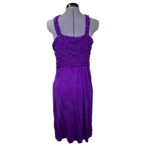 Rising International purple sleeveless mini dress with patchwork details and patchwork flowers. Lightweight material with great drape and stretch. Smocked in the top area. Made in Nepal