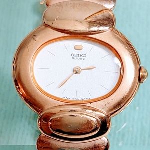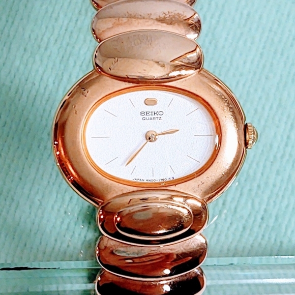 This is a very pretty watch in used condition for the collector. Photos don't do this watch justice, it's a beautiful timepiece that's been worn but will be an enviable vintage accessory with a polish. Rose gold tone finish with white face and comfortable band on stainless steel. Could ship with new battery.
