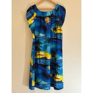 Vintage Royal Hawaiian women’s dress, size Large. Classic 1950s-inspired maxi hostess MuMu featuring a tropical blue background with yellow sunset and palm tree scenery. Loose fit, sleeveless cut, and lightweight polyester fabric. Perfect for luau parties, cruises, tiki events, or resort wear. Collectible Aloha mid-century fashion with timeless retro island charm.