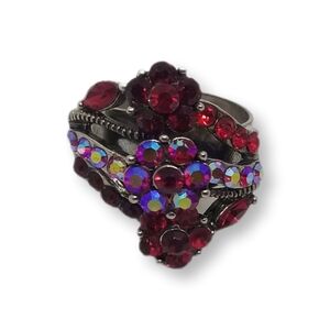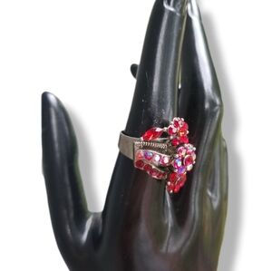 VINTAGE RUBY RED & AURORA BOREALIS RHINESTONE FLOWER DESIGN ADJUSTABLE RING