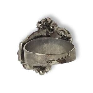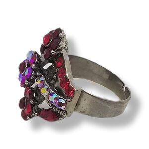 Lovely little vintage silvertone ring accented with ruby red and aurora borealis glass rhinestones in a floral pattern. Ring is currently a size 8 but can be adjusted up to a 10. Ring is in good condition with a small spot of wear on band as seen in last pic.