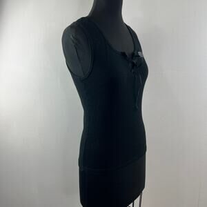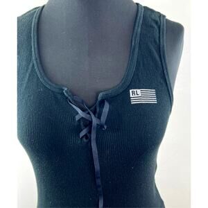 VINTAGE Ralph Lauren Black Tank Top Cotton Ribbed Knit Lace Up Scoop Sz Large L