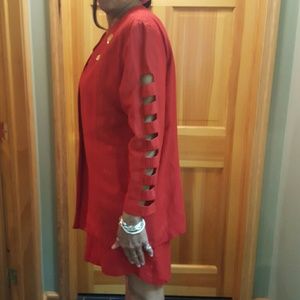 You will look stunning in this vintage red linen and rayon suit! Back in style with its peek-a-boo sleeves! Fully lined with zipper back and small slit in back of skirt. Great for a Summer Night Out! Small discoloration picture one left side halfway down, can be dyed, or crop and Taylor jacket for more modern look!